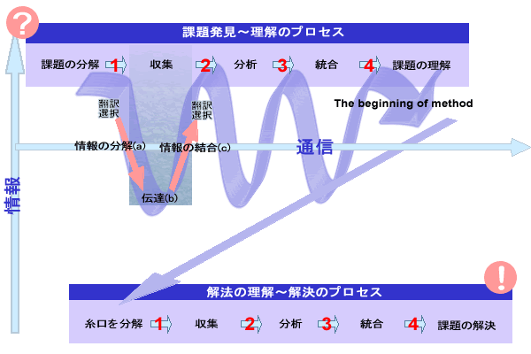 思考プロセスでは、上図のような1〜4のステップが繰り返され、各ステップには情報の (a)分解 (b)伝達 (c)結合 の子プロセスがあります。各プロセスでは、情報の「翻訳」「選択」が必ず行われています。ネクストマジックでは、このような思考プロセスの共通部分に着目して、各々の子プロセスの効率を極大化させる製品・サービスを開発します。それらを各ステップに応用して、最終的に、課題発見〜課題解決までの全思考プロセスの効率を極大化させます。