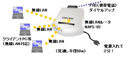 ノートパソコンを窓際まで持ち出して、PHS接続をされている方へ。クールスポット専用ルータ NAPS-02 を使うと、無線LANの届く範囲であれば、自由な場所でインターネット接続ができます。(NAPS-02は、上位回線にPHSを用いることが出来る無線LANルータです。PHS回線そのものの信号を延長するリピータではありません)