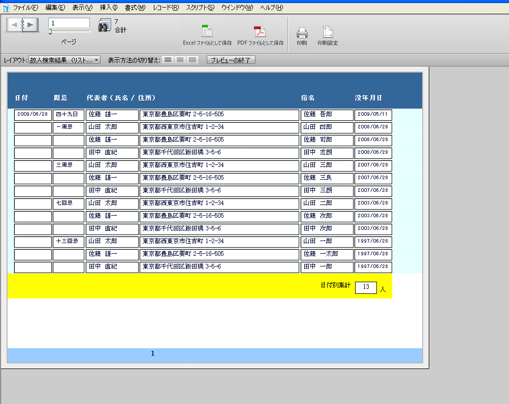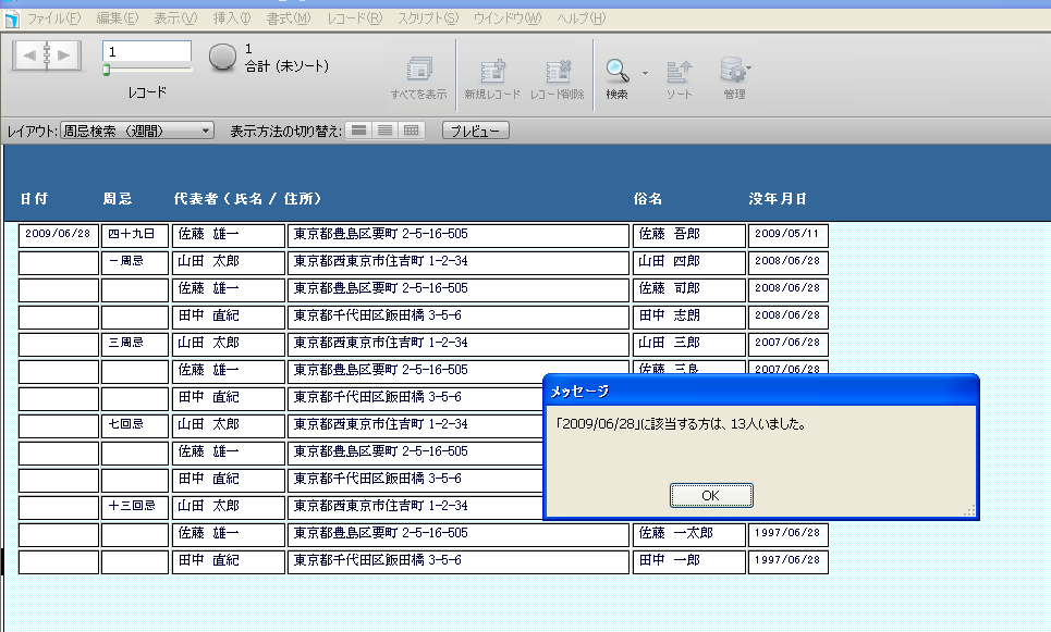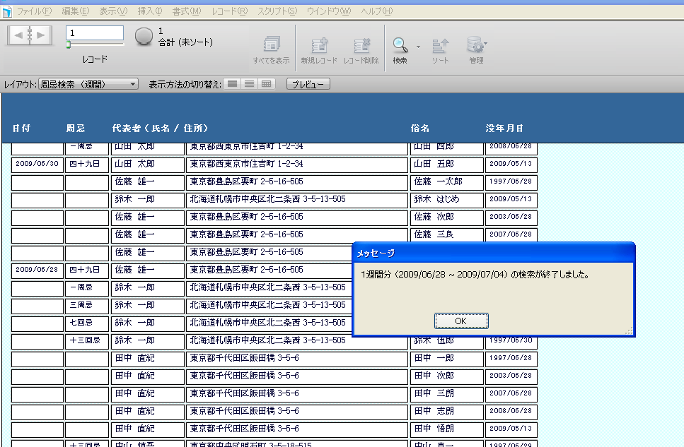 調べたい週の、四十九日、一周忌、三回忌、七回忌、十三回忌に該当する人を簡単に検索することができます。