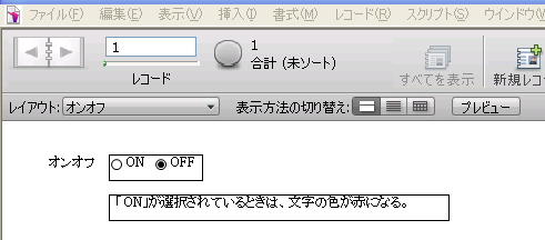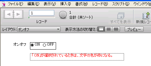 トップページ 技術情報 FileMaker開発 逆引きFileMaker FAQ 逆引きFileMaker FAQ ON/OFFのラジオボタンで、ONが選択されていた場合、文字の色を赤にするには?